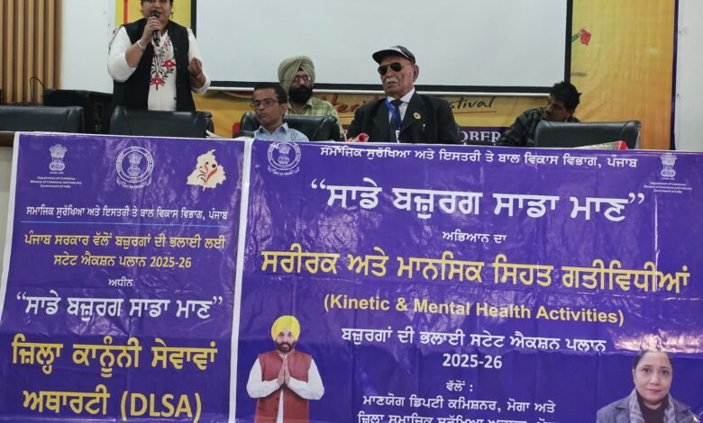 ਪੰਜਾਬ ਸਰਕਾਰ ਵੱਲੋਂ ਬਜ਼ੁਰਗਾਂ ਦੀ ਸੇਵਾ ਤੇ ਸਨਮਾਨ ਲਈ ਸ਼ੁਰੂ ਕੀਤੀ ਗਈ ‘ਸਾਡੇ ਬਜ਼ੁਰਗ, ਸਾਡਾ ਮਾਣ’ ਮੁਹਿੰਮ ਤਹਿਤ ਸਮਾਜਿਕ ਸੁਰੱਖਿਆ ਅਤੇ ਇਸਤਰੀ ਤੇ ਬਾਲ ਵਿਕਾਸ ਵਿਭਾਗ ਅਤੇ ਜ਼ਿਲ੍ਹਾ ਪ੍ਰਸ਼ਾਸਨ ਮੋਗਾ ਦੀ ਅਗਵਾਈ ਹੇਠ ਮੋਗਾ ਦੇ ਗੁਰੂ ਨਾਨਕ ਕਾਲਜ ਵਿਖੇ ਵਿਸ਼ੇਸ਼ ਕੈਂਪ ਲਗਾਇਆ ਗਿਆ। ਕੈਂਪ ਵਿੱਚ ਮਿਸ ਕਿਰਨ ਜਯੋਤੀ ਸੀ.ਜੇ.ਐਮ.-ਕਮ-ਸਕੱਤਰ ਜ਼ਿਲ੍ਹ ਕਾਨੂੰਨੀ ਸੇਵਾਵਾਂ ਅਥਾਰਟੀ ਮੋਗਾ ਨੇ ਵਿਸ਼ੇਸ਼ ਤੌਰ ਤੇ ਸ਼ਿਰਕਤ ਕੀਤੀ। ਇਸ ਮੌਕੇ ਤੇ ਬਜੁਰਗਾਂ ਨੂੰ ਮੁਫਤ ਕਾਨੂੰਨੀ ਸੇਵਾਵਾਂ ਤੇ ਡਿਜੀਟਲ ਹੇਰਾਫੇਰੀ ਤੋਂ ਬਚਾਅ ਕਰਨ ਦੀ ਜਾਣਕਾਰੀ ਵੀ ਦਿੱਤੀ ਗਈ। ਇਸ ਕੈਂਪ ਵਿੱਚ ਮਿਸ ਭਾਰਤੀ ਸੀ.ਐਮ. ਦੀ ਯੋਗਸ਼ਾਲਾ ਵੱਲੋਂ ਬਜੁਰਗਾਂ ਨੂੰ ਯੋਗ ਸਿਖਾਇਆ ਗਿਆ ਤੇ ਇਸ ਦੇ ਲਾਭ ਸਬੰਧੀ ਮਹੱਤਵਪੂਰਨ ਜਾਣਕਾਰੀ ਵੀ ਸਾਂਝੀ ਕੀਤੀ ਗਈ। ਕਾਲਜ ਦੀਆਂ ਵਿਦਿਆਰਥਣਾਂ ਵੱਲੋਂ ਵੀ ਪੰਜਾਬੀ ਵਿਰਸੇ ਨਾਲ ਸਬੰਧਤ ਕਵਿਤਾਵਾਂ ਤੇ ਲੋਕ ਨਾਚ ਗਿੱਧਾ ਪੇਸ਼ ਕੀਤਾ ਗਿਆ। ਇਸ ਕੈਂਪ ਵਿੱਚ ਸਰੀਰਿਕ ਅਤੇ ਮਾਨਸਿਕ ਗਤੀਵਿਧੀਆਂ ਬਾਰੇ ਜਾਣਕਾਰੀ ਦਿੱਤੀ ਗਈ। ਬਜੁਰਗਾਂ ਅਤੇ ਯੁਵਾ ਪੀੜੀ ਵਿੱਚ ਆ ਰਹੇ ਅੰਤਰ ਨੂੰ ਖਤਮ ਕਰਨ ਲਈ ਪੀੜੀਆਂ ਵਿਚਕਾਰ ਬੰਧਨ ਦੀਆਂ ਗਤੀਵਿਧੀਆਂ ਨੂੰ ਜਾਰੀ ਰੱਖਣ ਤੇ ਆਪਸੀ ਸਾਂਝ ਨੂੰ ਵਧਾਉਣ ਲਈ ਉਪਰਾਲੇ ਕਰਨ ਲਈ ਜਾਣਕਾਰੀ ਸਾਂਝੀ ਕੀਤੀ ਗਈ। ਬਜ਼ੁਰਗਾਂ ਦੀ ਸਹਾਇਤਾ ਲਈ ਟੋਲ ਫ੍ਰੀ ਹੈਲਪਲਾਈਨ 14567 ਬਾਰੇ ਵੀ ਜਾਣਕਾਰੀ ਸਾਂਝੀ ਕੀਤੀ ਗਈ। ਜ਼ਿਲ੍ਹਾ ਪ੍ਰੋਗਰਾਮ ਅਫ਼ਸਰ ਅਤੇ ਜ਼ਿਲ੍ਹਾ ਸਮਾਜਿਕ ਸੁਰੱਖਿਆ ਅਫ਼ਸਰ ਗੁਰਜੀਤ ਕੌਰ ਵੱਲੋਂ ਕੈਂਪ ਵਿੱਚ ਬਜ਼ੁਰਗਾਂ ਨੂੰ ਉਨ੍ਹਾਂ ਦੇ ਅਧਿਕਾਰਾਂ ਅਤੇ ਸਰਕਾਰੀ ਸਹਾਇਤਾ ਪ੍ਰਣਾਲੀ ਨਾਲ ਜੋੜਨ ਉੱਤੇ ਵਿਸ਼ੇਸ਼ ਜ਼ੋਰ ਦਿੱਤਾ। ਉਹਨਾਂ ਕਿਹਾ ਕਿ ਸਰਕਾਰੀ ਦਿਸ਼ਾ ਨਿਰਦੇਸ਼ਾਂ ਤਹਿਤ ਪ੍ਰਸ਼ਾਸ਼ਨ ਦੀ ਮੱਦਦ ਨਾਲ ਭਵਿੱਖ ਵਿੱਚ ਵੀ ਅਜਿਹੇ ਕੈਂਪ ਜਾਰੀ ਰਹਿਣਗੇ । ਇਸ ਮੌਕੇ ਹੋਰਨਾਂ ਤੋਂ ਇਲਾਵਾ ਸਮੂਹ ਦਫਤਰੀ ਸਟਾਫ, ਬਾਲ ਵਿਕਾਸ ਪ੍ਰੋਜੈਕਟ ਅਫ਼ਸਰ ਮੋਗਾ -1, ਸੀਨੀਅਰ ਸਿਟੀਜਨ ਐਸੋਸੀਏਸ਼ਨ ਦੇ ਪ੍ਰਧਾਨ ਸਰਦਾਰੀ ਲਾਲ ਅਤੇ ਉਹਨਾਂ ਦੀ ਟੀਮ ਮੈਂਬਰਾਂ ਵੱਲੋਂ ਸ਼ਮੂਲੀਅਤ ਕੀਤੀ ਗਈ।