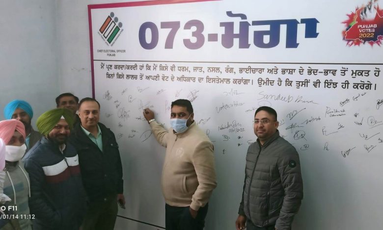 ਇਨ੍ਹਾਂ ਸ਼ਬਦਾਂ ਦਾ ਪ੍ਰਗਟਾਵਾ ਉਪ ਮੰਡਲ ਮੈਜਿਸਟ੍ਰੇਟ ਮੋਗਾ ਸ੍ਰੀ ਸਤਵੰਤ ਸਿੰਘ ਨੇ ਅੱਜ ਆਪਣੇ ਦਫ਼ਤਰ ਵਿਖੇ ਹਸਤਾਖਰ ਮੁਹਿੰਮ ਦੀ ਸ਼ੁਰੂਆਤ ਕਰਦਿਆਂ ਕੀਤਾ। ਇਸ ਮੌਕੇ ਡਿਪਟੀ ਕਮਿਸ਼ਨਰ ਦਫ਼ਤਰ ਦੀਆਂ ਸਮੂਹ ਬਰਾਂਚਾਂ ਦੇ ਅਧਿਕਾਰੀਆਂ/ਕਰਮਚਾਰੀਆਂ ਨੇ ਪ੍ਰਣ ਲਿਆ ਕਿ ਅਸੀਂ ਕਿਸੇ ਵੀ ਧਰਮ, ਜਾਤ, ਨਸਲ, ਰੰਗ, ਭਾਈਚਾਰਾ ਅਤੇ ਭਾਸ਼ਾ ਦੇ ਭੇਦਭਾਵ ਤੋਂ ਮੁਕਤ ਹੋ ਕੇ ਬਿਨ੍ਹਾਂ ਕਿਸੇ ਲਾਲਚ ਤੋਂ ਆਪਣੀ ਵੋਟ ਦੇ ਅਧਿਕਾਰ ਦਾ ਇਸਤੇਮਾਲ ਕਰਾਂਗੇ। ਸਮੂਹ ਮੁਲਾਜ਼ਮਾਂ ਨੇ ਇਹ ਪ੍ਰਣ ਲੈ ਕੇ ਹਸਤਾਖਰ ਵੀ ਕੀਤੇ।