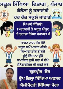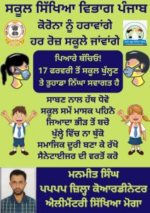 मोगा 16 फरवरी 2022 ( Charanjit Singh) आज जिला शिक्षा अफसर एलीमेंट्री शिक्षा वरिंद्र पाल सिंह और जिला शिक्षा अफसर सेकेंडरी शिक्षा सुशील कुमार तुली द्वारा संयुक्त रूप से जारी एक विज्ञप्ति में बताया गया कि विगत दिनों छठी से बारहवीं तक स्कूल स्कूल शिक्षा विभाग पंजाब के द्वारा खोले गए थे लेकिन दिनांक 17 फरवरी 2022 से प्री प्राइमरी से पांचवी तक कक्षाओं के विद्यार्थी भी स्कूल में विभागीय हिदायत और नियमानुसार स्कूल में आ सकेंगे ।उन्होंने बताया कि इस बात को लेकर अभिभावकों विद्यार्थियों और अध्यापकों में प्रसन्नता की लहर है । कोरोना की तीसरी लहर के चलते पिछले लंबे समय से स्कूल विद्यार्थियों के लिए बंद थे जबकि ऑनलाइन कक्षाओं के द्वारा अध्यापकों और विद्यार्थियों में परस्पर समन्वय बना हुआ था। उन्होंने बताया कि परीक्षा के दिन नजदीक होने के कारण अध्यापक और अभिभावक विद्यार्थियों के भविष्य को लेकर विशेषत: चिंतित नजर आ रहे थे। लेकिन कोरोना की लहर की समाप्ति के मद्देनजर स्कूल शिक्षा विभाग द्वारा लिया गया फैसला स्वागत योग्य है। उन्होंने विद्यार्थियों को कोविड नियमों की पालना करते हुए स्कूल में शिक्षा गतिविधियों में बढ़-चढ़कर भाग लेने के लिए प्रोत्साहित किया।