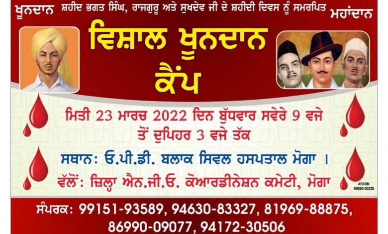 23 ਮਾਰਚ ਨੂੰ ਸ਼ਹੀਦ ਭਗਤ ਸਿੰਘ, ਰਾਜਗੁਰੂ ਅਤੇ ਸੁਖਦੇਵ ਦੇ ਸ਼ਹੀਦੀ ਦਿਹਾੜੇ ਮੌਕੇ ਸਿਵਲ ਹਸਪਤਾਲ ਮੋਗਾ ਵਿੱਚ ਵਿਸ਼ਾਲ ਖੂਨਦਾਨ ਕੈਂਪ ਦਾ ਆਯੋਜਨ