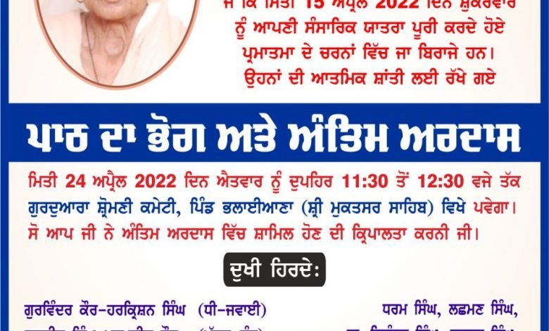 ਮਾਤਾ ਨਸੀਬ ਕੌਰ ਜੋ ਕਿ ਪਿਛਲੇ ਦਿਨੀਂ ਆਪਣੇ ਸਵਾਸਾਂ ਰੂਪੀ ਪੂੰਜੀ ਨੂੰ ਪੂਰਾ ਕਰਦੇ ਹੋਏ ਸਾਨੂੰ ਸਦੀਵੀ ਵਿਛੋੜਾ ਦੇ ਗਏ ਹਨ ਉਨ੍ਹਾਂ ਦੀ ਅੰਤਿਮ ਅਰਦਾਸ ਮਿਤੀ 24 ਅਪ੍ਰੈਲ ਦਿਨ ਐਤਵਾਰ ਨੂੰ ਪਿੰਡ ਭਲਾਈਆਣਾ ਦੇ ਕਮੇਟੀ ਵਾਲਾ ਗੁਰਦੁਆਰਾ ਸਾਹਿਬ ਵਿਖੇ ਹੋਵੇਗੀ ਸਮੂਹ ਸੰਗਤਾਂ ਨੂੰ ਅਰਦਾਸ ਵਿੱਚ ਸ਼ਾਮਲ ਹੋਣ ਦੀ ਬੇਨਤੀ ਹੈ ਜੀ ।
