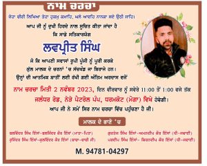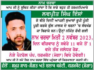 ਅੰਤਿਮ ਅਰਦਾਸ ਵਜੋਂ ਨਾਮ ਚਰਚਾ ਮਿਤੀ 2-11-23 ਨੂੰ ਧਰਮਕੋਟ ਵਿਖੇ ਹੋਵੇਗੀ।