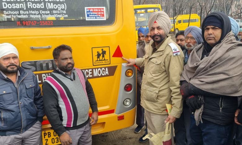 ਮੋਗਾ, 5 ਫਰਵਰੀ:ਪੰਜਾਬ ਸਰਦਾਰ ਦੇ ਦਿਸ਼ਾ ਨਿਰਦੇਸ਼ਾਂ ਤਹਿਤ ਰਾਸ਼ਟਰੀ ਸੜਕ ਸੁਰੱਖਿਆ ਮਹੀਨੇ ਦੀਆਂ ਜਾਗਰੂਕਤਾ ਗਤੀਵਿਧੀਆਂ ਦੀ ਲੜੀ ਵਿੱਚ ਅੱਜ ਸੇਕਰਡ ਹਾਰਟ ਸਕੂਲ ਮੋਗਾ ਦੇ ਡਰਾਈਵਰਾਂ ਤੇ ਕੰਡਰਕਟਰਾਂ ਨੂੰ ਆਵਾਜਾਈ ਨਿਯਮਾਂ ਬਾਰੇ ਜਾਗਰੂਕ ਕੀਤਾ ਗਿਆ। ਟ੍ਰੈਫਿਕ ਪੁਲਿਸ ਮੋਗਾ ਵੱਲੋਂ ਸਕੂਲੀ ਵੈਨਾਂ ਉੱਪਰ ਰਿਫਲੈਕਟਰ ਵੀ ਲਗਾਏ ਗਏ।