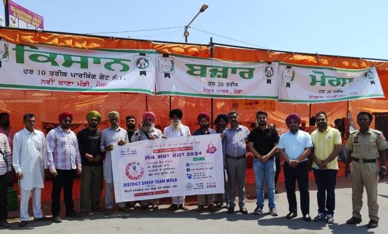 ਇਸਦੀ ਲਗਾਤਾਰਤਾ ਵਿੱਚ ਅੱਜ ਮੋਗਾ ਦੀ ਨਵੀਂ ਅਨਾਜ਼ ਮੰਡੀ ਵਿੱਚ ਲੱਗੇ ਕਿਸਾਨ ਬਜ਼ਾਰ ਵਿੱਚ ਵੀ ਸਵੀਪ ਗਤੀਵਿਧੀਆਂ ਆਯੋਜਿਤ ਕੀਤੀਆਂ ਗਈਆਂ ਤਾਂ ਕਿ ਕਿਸਾਨਾਂ ਅਤੇ ਗ੍ਰਾਹਕਾਂ ਨੂੰ ਵੋਟ ਦੇ ਸਹੀ ਇਸਤੇਮਾਲ ਬਾਰੇ ਜਾਗਰੂਕ ਕੀਤਾ ਜਾ ਸਕੇ। ਇਸ ਸਮੇਂ ਜ਼ਿਲ੍ਹਾ ਸਵੀਪ ਨੋਡਲ ਅਫ਼ਸਰ ਮੋਗਾ ਸ੍ਰੀ ਗੁਰਪ੍ਰੀਤ ਸਿੰਘ ਘਾਲੀ, ਸਵੀਪ ਨੋਡਲ ਅਫ਼ਸਰ ਹਲਕਾ ਮੋਗਾ ਅਮਨਦੀਪ ਗੋਸਵਾਮੀ, ਸਾਬਕਾ ਸਵੀਪ ਨੋਡਲ ਅਫ਼ਸਰ ਬਲਵਿੰਦਰ ਸਿੰਘ ਮੌਜੂਦ ਰਹੇ।