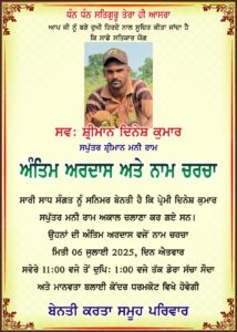 ਧਰਮਕੋਟ 6 ਜੁਲਾਈ 2025 (ਚਰਨਜੀਤ ਸਿੰਘ) ਬਲਾਕ ਧਰਮਕੋਟ ਦੇ ਅਧੀਨ ਪੈਂਦੇ ਪਿੰਡ ਜਲਾਲਾਬਾਦ ਪੂਰਬੀ ਦੇ ਪ੍ਰੇਮੀ ਸੇਵਕ ਪ੍ਰੇਮੀ ਦਿਨੇਸ਼ ਕੁਮਾਰ ਇੰਸਾਂ ਜੋ ਕਿ ਸ਼ਾਹ ਸਤਿਨਾਮ ਜੀ ਗ੍ਰੀਨ ਐਸ ਵੈਲਫੇਅਰ ਕਮੇਟੀ ਦੇ ਮੈਂਬਰ ਸਨ ਦੀ ਆਪਣੀ ਵਰਕਸ਼ਾਪ ਤੇ ਕਰੰਟ ਲੱਗਣ ਕਾਰਨ ਅਚਾਨਕ ਮੌਤ ਹੋ ਗਈ ਦੀ ਅੰਤਿਮ ਅਰਦਾਸ ਵਜੋਂ ਨਾਮ ਚਰਚਾ ਡੇਰਾ ਸੱਚਾ ਸੌਦਾ ਅਤੇ ਮਾਨਵਤਾ ਭਲਾਈ ਕੇਂਦਰ ਧਰਮਕੋਟ ਵਿਖੇ ਮਿਤੀ 6 ਜੁਲਾਈ ਦਿਨ ਐਤਵਾਰ ਸਮਾਂ 11 ਵਜੇ ਤੋਂ 1 ਵਜੇ ਤੱਕ ਹੋਵੇਗੀ। ਸਮੂਹ ਸਾਧ ਸੰਗਤ ਅਤੇ ਨਗਰ ਨਿਵਾਸੀਆਂ ਨੂੰ ਸਨਿਮਰ ਬੇਨਤੀ ਹੈ ਕਿ ਅੰਤਿਮ ਅਰਦਾਸ ਦੀ ਨਾਮ ਚਰਚਾ ਤੇ ਪਹੁੰਚ ਕੇ ਪ੍ਰੇਮੀ ਦਿਨੇਸ਼ ਕੁਮਾਰ ਇੰਸਾਂ ਨੂੰ ਸ਼ਰਧਾ ਦੇ ਫੁੱਲ ਭੇਟ ਕੀਤੇ ਜਾਣ। ਪ੍ਰੇਮੀ ਦਿਨੇਸ਼ ਕੁਮਾਰ ਦੁਆਰਾ ਕੀਤੀ ਨਿਸ਼ਕਾਮ ਸੇਵਾ ਕਰਕੇ ਉਨ੍ਹਾਂ ਦਾ ਨਾਮ ਧਰੂੰ ਤਾਰੇ ਦੀ ਤਰ੍ਹਾਂ ਚਮਕਦਾ ਰਹੇਗਾ।